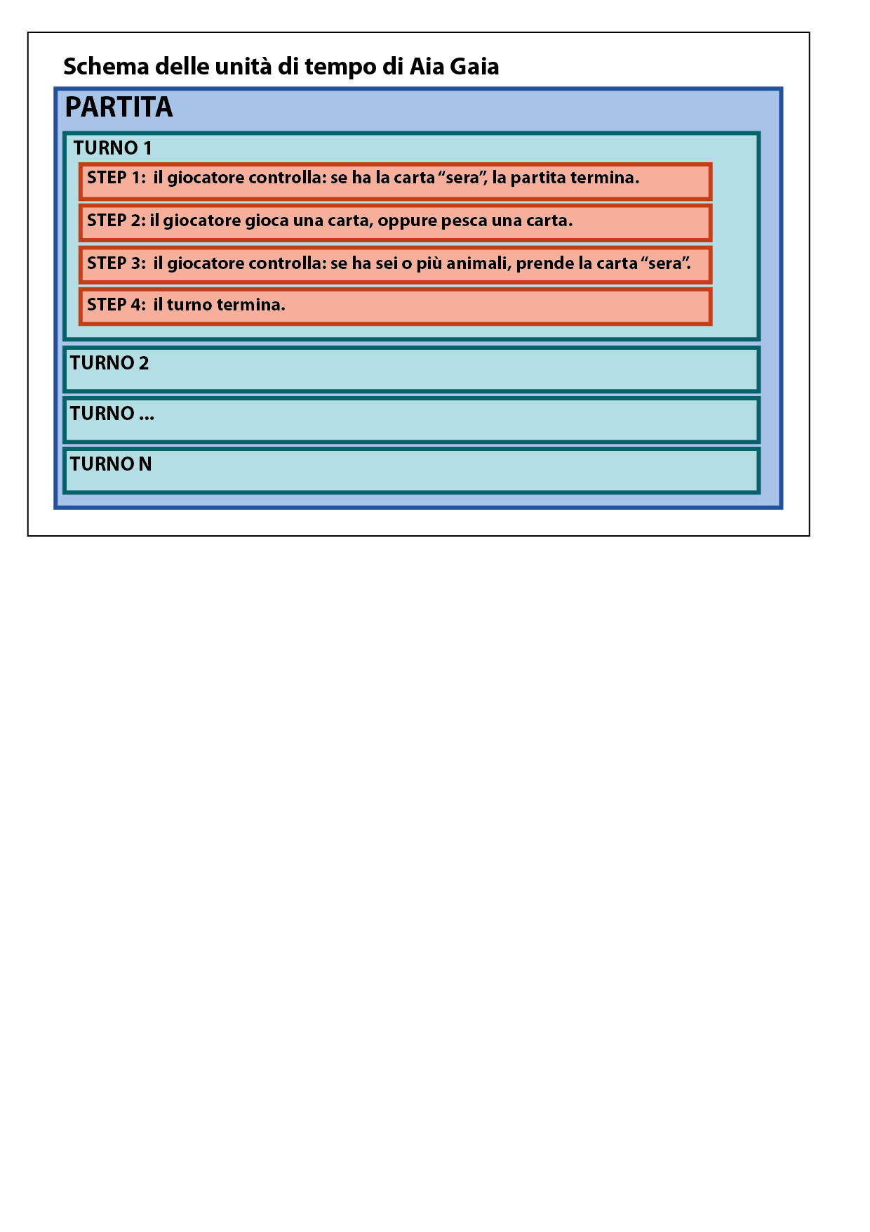 È opportuno ricordare che non è affatto detto che ogni gioco abbia tutte queste suddivisioni in termini di tempo: se alla fine di un giro completo di turni non c’è necessità di fare niente (perché non c’è un cambio di “primo giocatore”, i giocatori pescano carte o effettuano altre azioni automatiche durante il turno) e il gioco prosegue naturalmente, non ci sarà alcun bisogno di utilizzare il “round”. Vediamo un esempio di schema davvero molto semplice con il mio Aia Gaia. In Aia Gaia i giocatori giocano a turno, e nel proprio turno possono pescare una carta dal mazzo comune oppure giocare una carta e applicarne gli effetti (oltre a eventuali effetti, ogni carta ha un valore, e alla fine della partita la somma di questi valori determinerà il punteggio finale di ogni giocatore.). Se un giocatore, alla fine del turno, ha sei o più carte davanti a sé, prende la carta “sera”. Quando il turno tocca nuovamente a lui, prima di fare qualsiasi cosa, la partita termina (questo fa sì che se un giocatore “chiude” gli altri abbiano un turno a testa per calare carte o provare a “rompergli le scatole” usando effetti vari). Solo alla fine si contano i punti. Come si traduce tutto questo a livello schematico? Semplice, ecco qua: