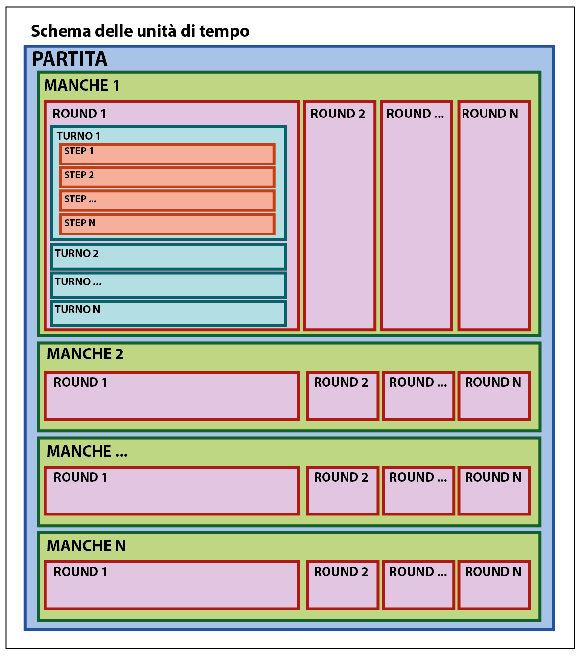 Come possiamo vedere, non solo non c’è una manche, ma non c’è neanche un round: come in giochi come Carcassonne (o Bang!, o mille altri) non c’è un momento a “inizio” o “fine” giro in cui succede qualcosa, quindi il round non è necessario. Servono soltanto i turni, a loro volta composti da una serie di “passaggi”.
