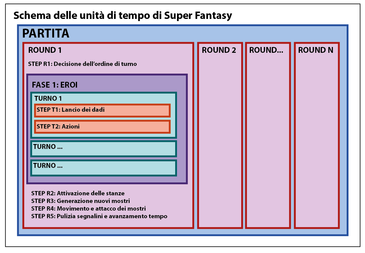 Aggiungo, per amor di completezza, alcuni casi particolari. In alcuni giochi può essere previsto che “il gioco”, tramite una sorta di intelligenza artificiale, abbia i suoi “turni” o una o più “fasi” in cui, per esempio, si muovono pedine o si verificano eventi (pensate alla “fase dei mostri” nei dungeon crawler, per fare l’esempio più semplice). Si tratta ovviamente di una cosa che emerge “lato giocatore”, ma dal punto di vista del design probabilmente si tratta solo di (complessi) automatismi posti alla fine di un round o dei turni dei giocatori. Nel nostro schema, probabilmente, saranno una lista di step alla fine del round (che possiamo, oppure no, inserire in una fase per comodità, ma non è necessario). Per esempio, ecco lo schema base che ho usato per Super Fantasy (versione senza Master):
