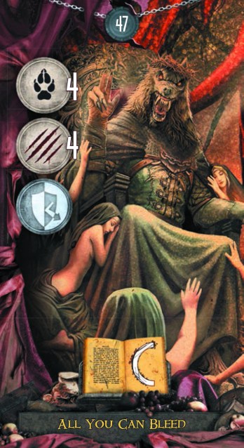 L’orma e l’artigliata definiscono il movimento del Powerwolf e il suo valore di combattimento di base. Eventuali icone sotto questi due valori, invece, rappresentano le abilità speciali (schivate, balzi, cure, furtività e così via). La lettera nel libro in basso, invece, definirà parte delle azioni degli Strigoi (che sostanzialmente pattugliano la fortezza e menano come fabbri). Alla fine del turno di ciascun giocatore, infatti, la carta giocata e una tessera pescata da una pila forniranno ai giocatori le informazioni necessarie a muovere i vampiri, determinando anche l’intensità dell’attacco.