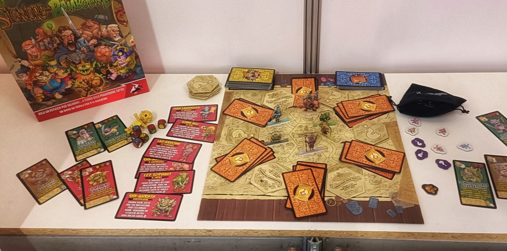 Il Signore delle Bamboline è uno spin-off di Vudù, che riprende il core loop di Vudù (usando dei dadi si lanciano Maledizioni che hanno un effetto fisico sulle altre persone al tavolo), ma sostituisce il classico sistema lineare di punteggio con una ricerca avventurosa, quella per l’Unica Bambolina, che porterà lo strampalato gruppo di orchetti in terre come il Rifugio Elfico Nascosto Così Così, il Monte Eccezionalmente Alto o la Capitale Costruita In Un Luogo Impervio.